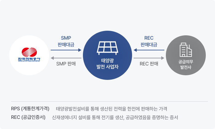 장기간 SMP + REC 수익 창출태양광 발전 사업자는 전기를 생산해 한전에 판매하는 SMP 수익과, 발급받은 REC를 의무공급자에게 판매해 얻는 REC 수익까지 모두 확보할 수 있습니다.