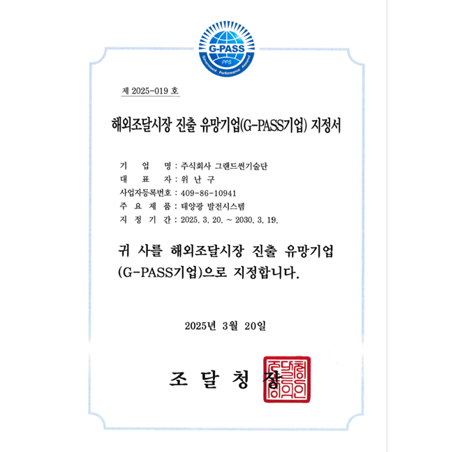 태양광 EPC 전문기업 그랜드썬기술단이 지난 20일, 조달청으로부터 ‘G-PASS(해외조달시장 진출 유망기업) 기업’ B등급을 부여받으며, 해외시장 진출을 위한 경쟁력을 공식 인증받았다고 28일 밝혔다.
