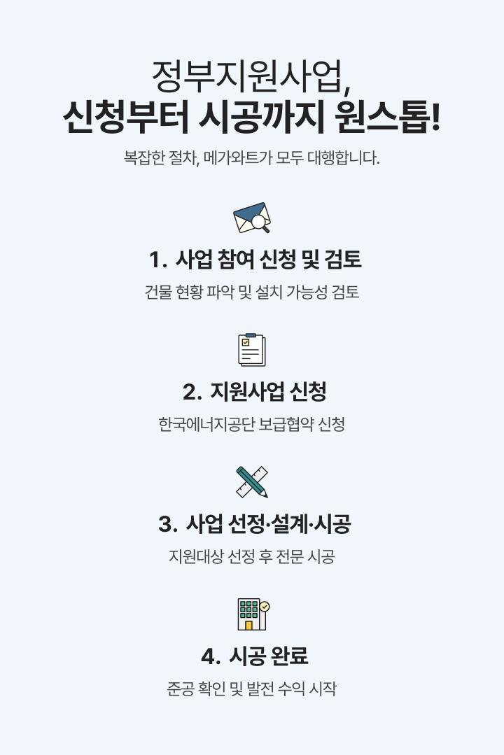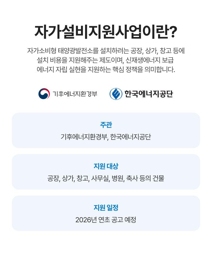뒤로가기 2026 자가설비지원사업, 건물·공장주라면 지금이 기회입니다! 성명 연락처 문의유형 문의유형을 선택해주세요발전사업자가소비RE100금융상품유지관리자재구매기타문의 사업지주소 내용 개인정보 수집 및 이용을 확인하고 동의합니다. 자세히보기 문의하기 개인정보 처리방침 닫기 목록으로
